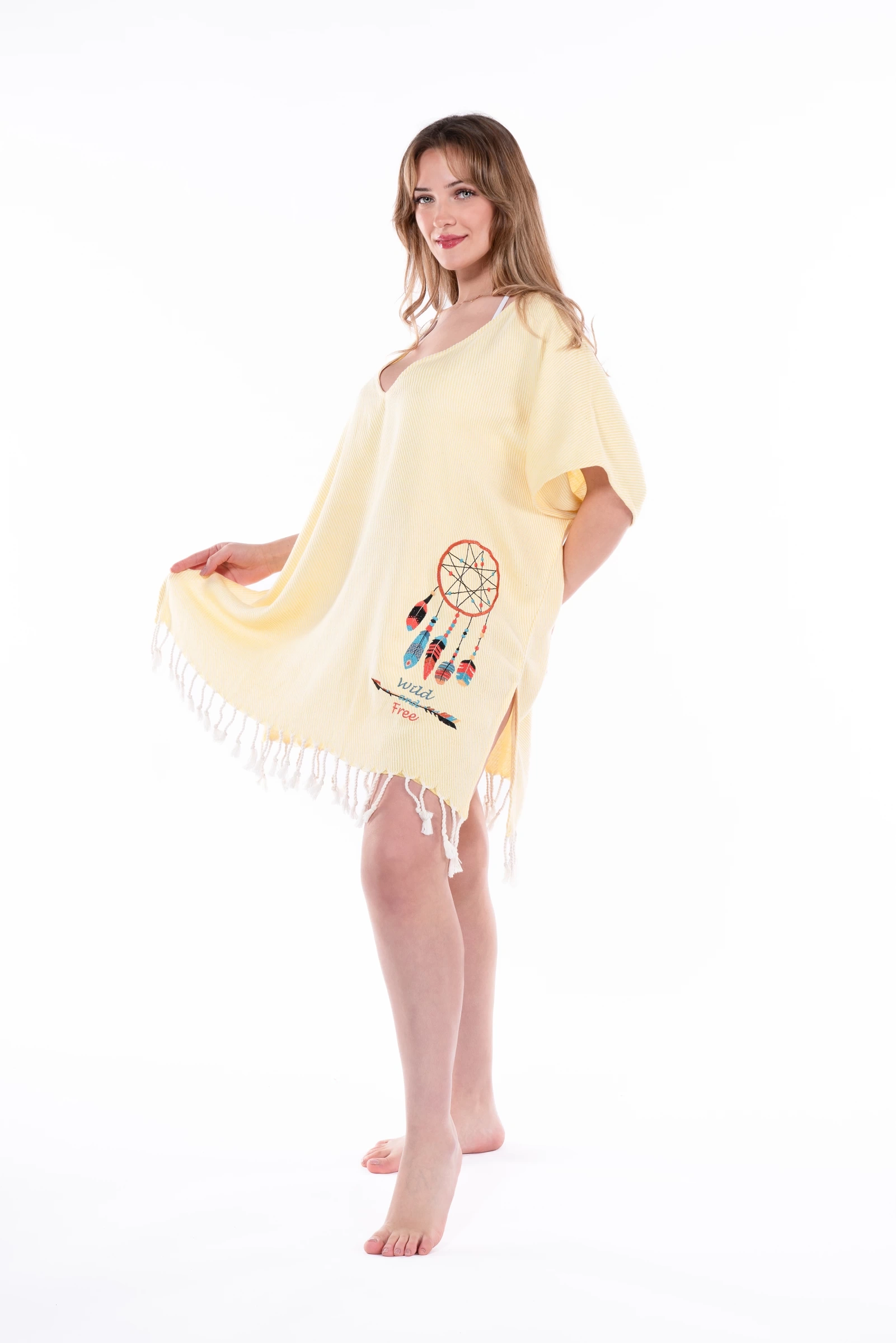 Atelier CHAPUTS'tan Dreamcatcher Yellow Dress ile gardırobunuzu yükseltin. Yüksek kaliteli pamuktan üretilen bu elbise, hem stil hem de konforu bir arada sunar. Tek beden tasarım, farklı vücut şekillerine mükemmel uyum sağlar ve imza nakış detayları, görünümünüze benzersiz bir dokunuş katar.