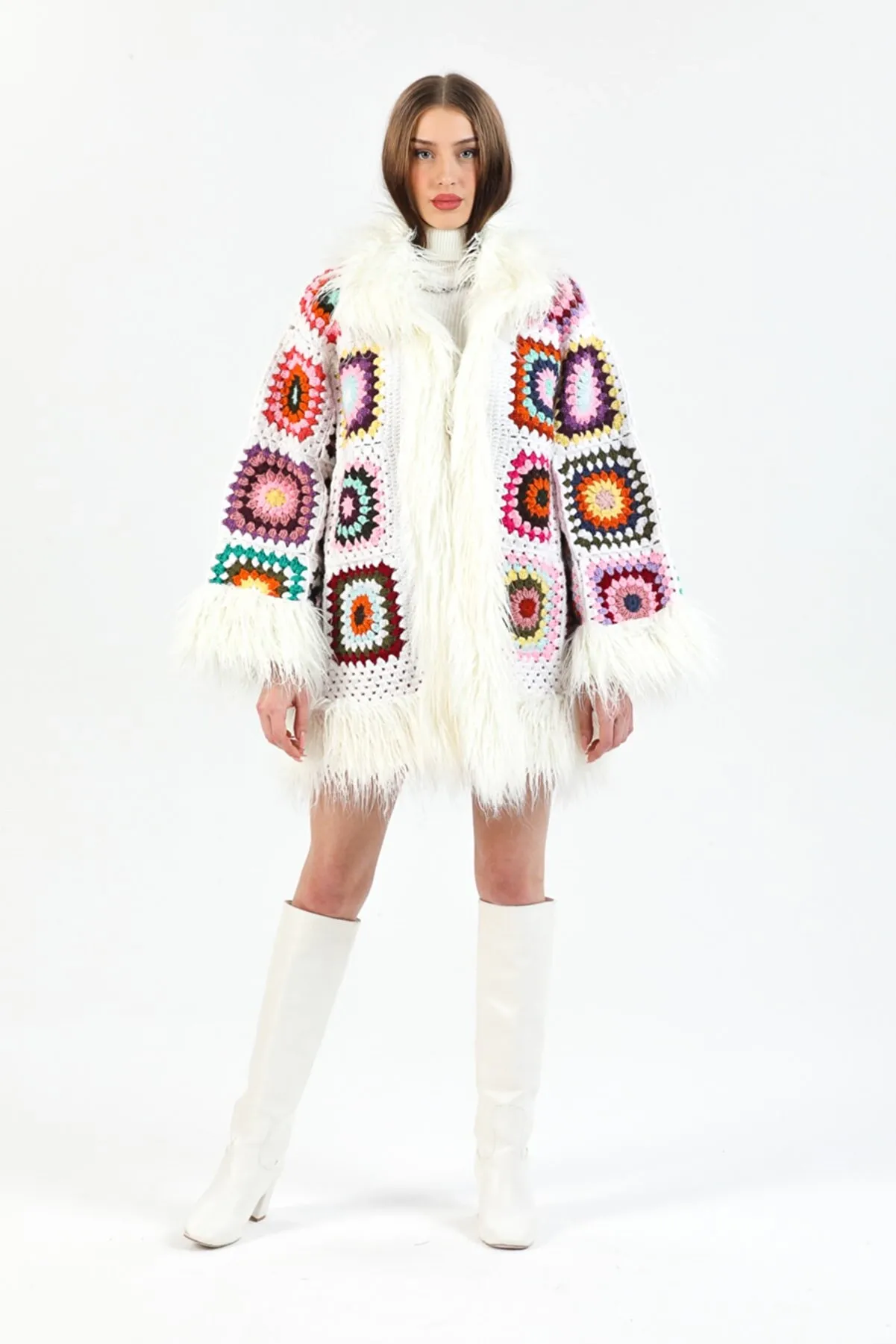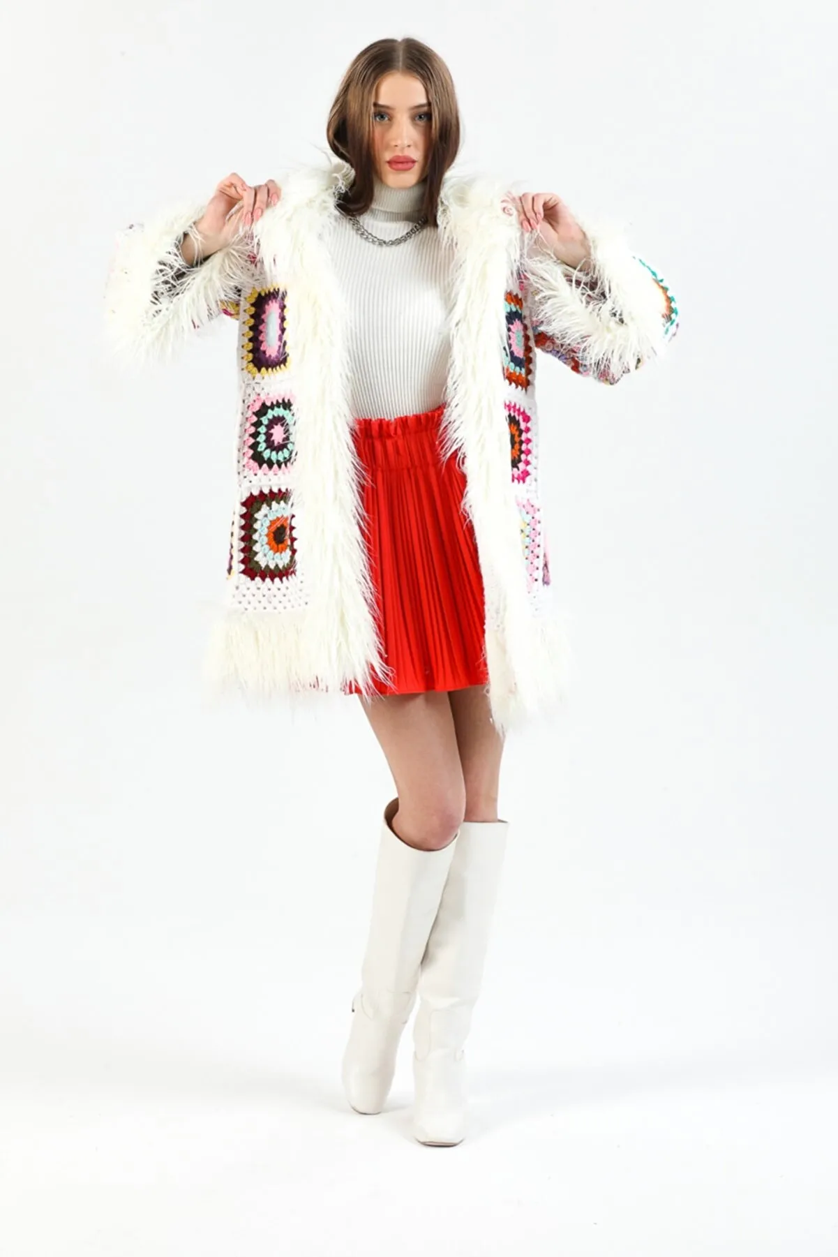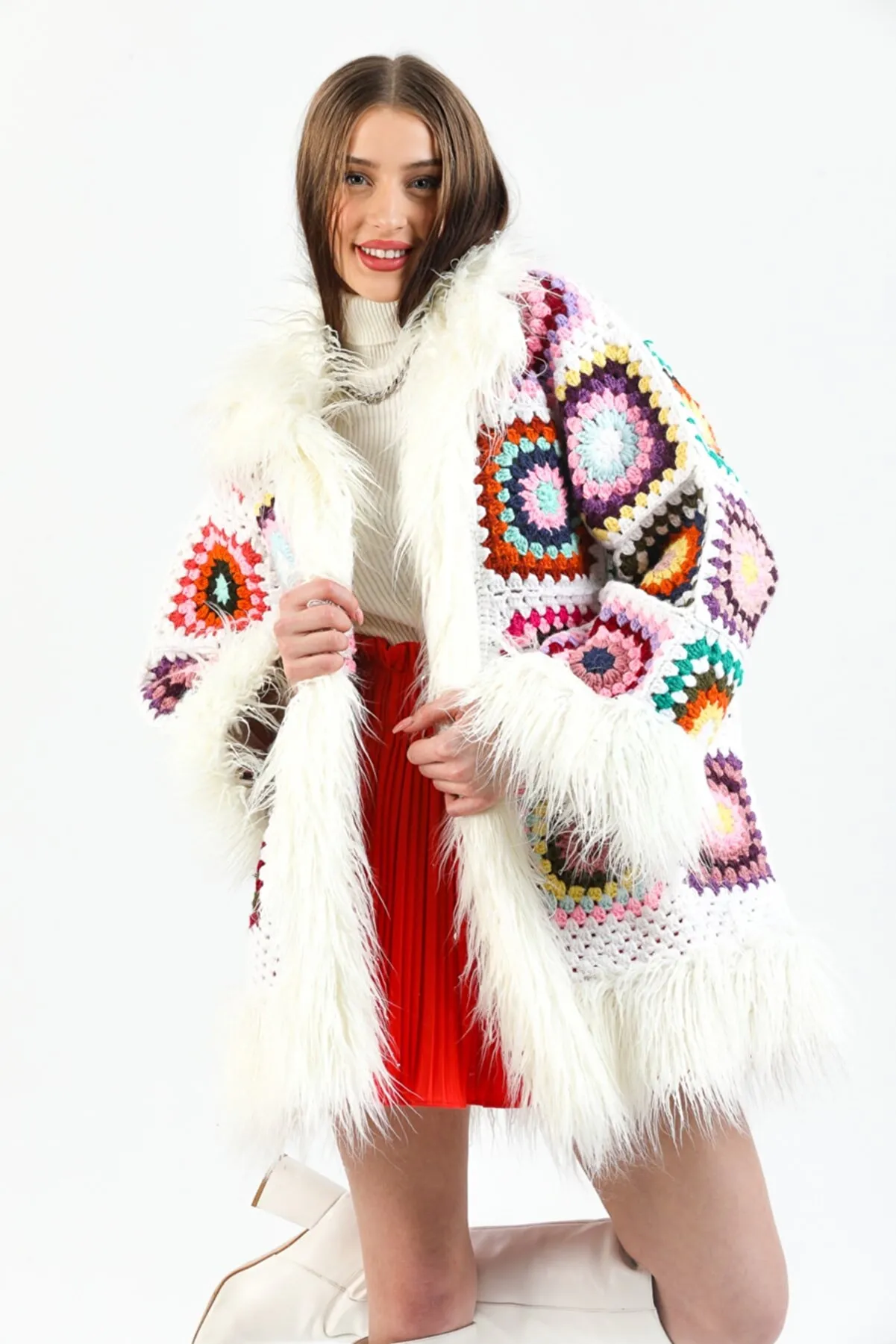 Lilly Suni Kürklü Tığ İşi Örgülü Yün Beyaz Kadın Hırka