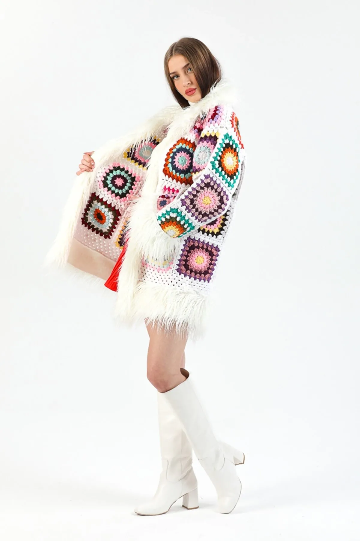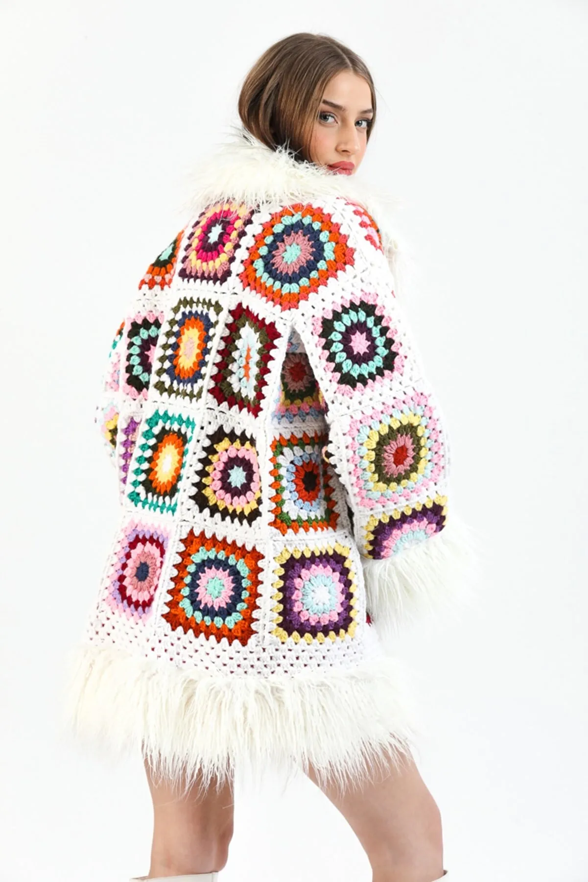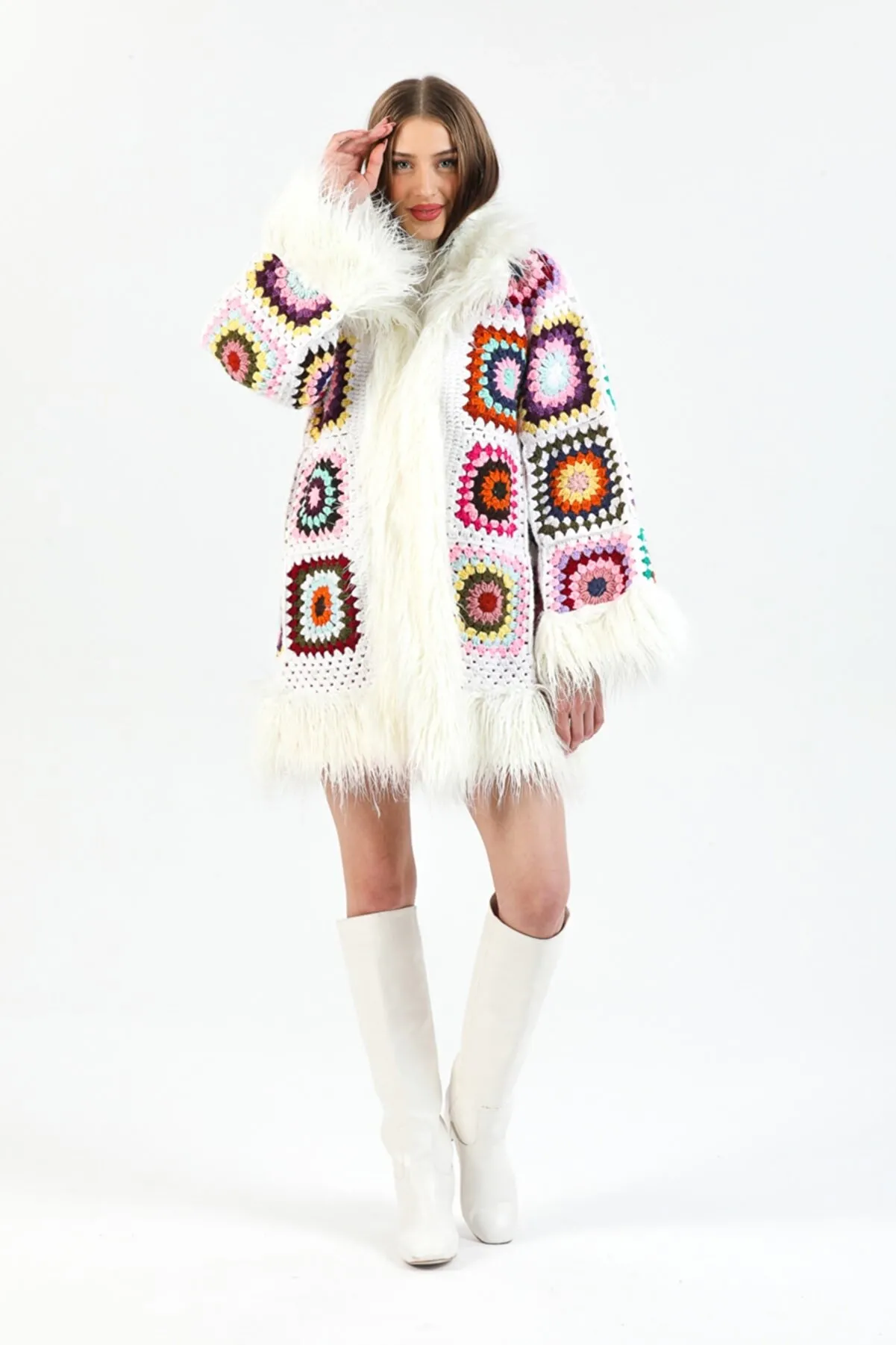 Lilly Suni Kürklü Tığ İşi Örgülü Yün Beyaz Kadın Hırka