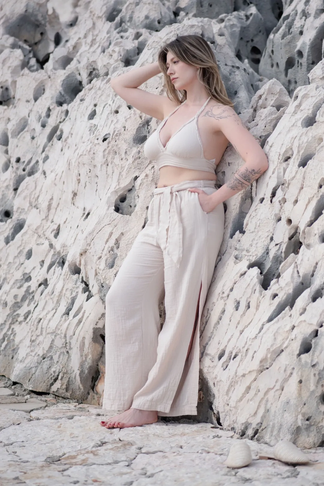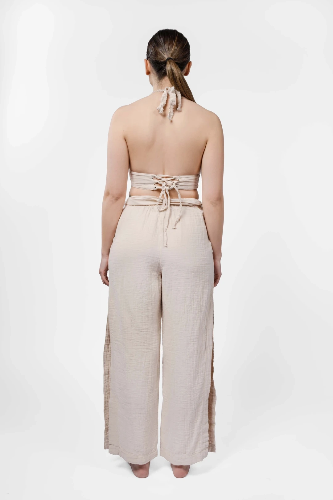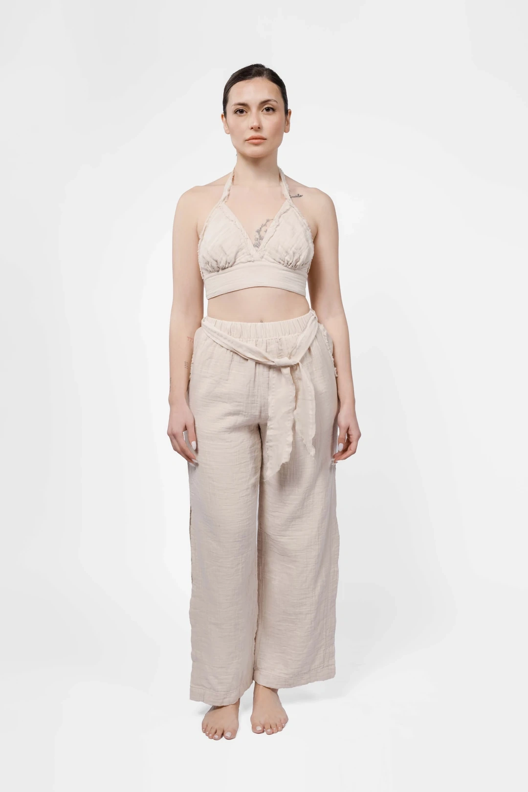 Designed for modern comfort and effortless elegance, these belted muslin trousers are crafted to meet the needs of boutique hotels, concept stores, and lifestyle brands seeking premium Turkish textiles. The relaxed silhouette features a flexible elastic waistband and a matching fabric belt, ensuring a comfortable and adjustable fit for a wide range of body types. Functional side pockets and subtle side slits add both practicality and a contemporary touch, making these trousers ideal for versatile, everyday wear.